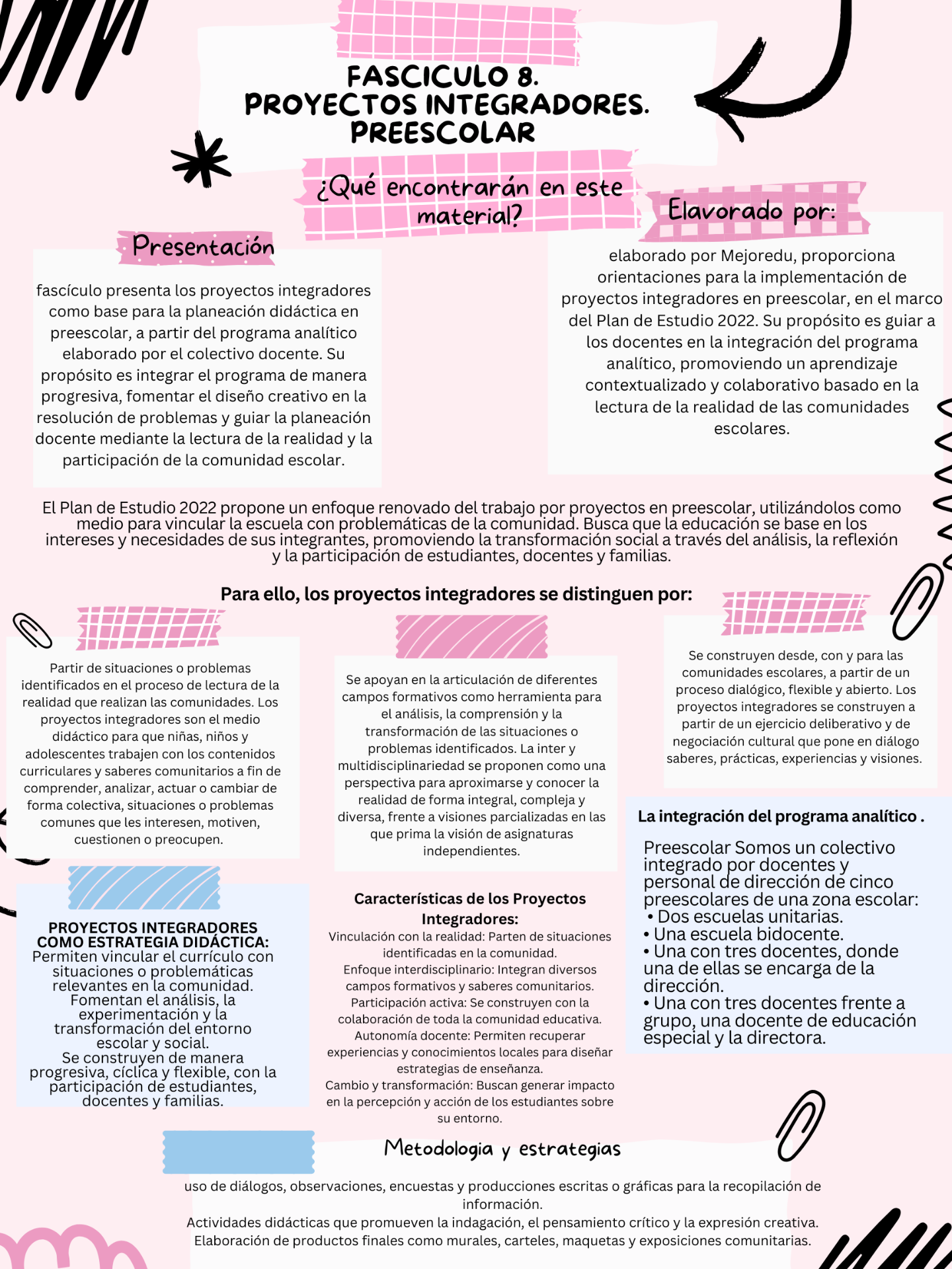 Este fascículo presenta los proyectos integradores como base para la planeación didáctica en preescolar, a partir del programa analítico elaborado por el colectivo docente. Su propósito es integrar el programa de manera progresiva, fomentar el diseño creativo en la resolución de problemas y guiar la planeación docente mediante la lectura de la realidad y la participación de la comunidad escolar.